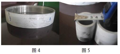 對(duì)5083/1060/Ti/N6/304L 五層復(fù)合板進(jìn)行校平后,機(jī)加成Ф245/Ф250mm,Ф55/Ф60mm,Ф35/Ф40mm 仿用戶接頭,并對(duì)接頭雙面PT 試驗(yàn)。PT 試驗(yàn)后無發(fā)現(xiàn)任何不結(jié)合現(xiàn)象,見圖4、圖5。