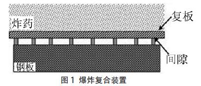 常規(guī)炸藥的穩(wěn)定爆轟距離,所以復(fù)合板使用自行研制的專用炸藥,并采用特殊的布藥工藝爆炸加工而成。工藝參數(shù)的選擇依據(jù)文獻(xiàn)[4]給出的式(1)計(jì)算,并在試驗(yàn)基礎(chǔ)上對(duì)其做了改進(jìn),式中me 為裝藥量,δ為基復(fù)板之間的支撐物高度, ,tp 分別為復(fù)板材料的密度和厚度, ,te 分別為炸藥密度及厚度。K 為與試驗(yàn)材料有關(guān)的系數(shù)。